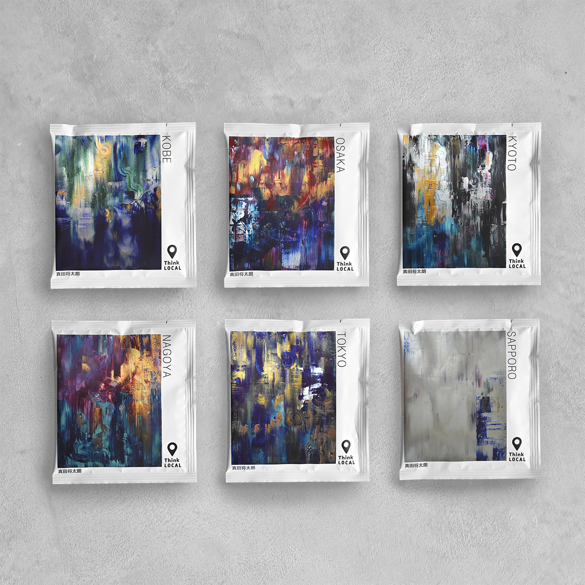 真田将太朗さんは「新しい風景」を主題とした抽象絵画を制作しているアーティスト。「旅するCOFFEE」のキッチンカーには、真田さんが各都市の重力や時間から着想を得て制作した抽象絵画があしらわれています。さらに、オリジナルドリップバッグのパッケージにも同作品を使用。それぞれの土地のバリスタが、真田さんの作品からイメージを膨らませてコーヒーを選びました。