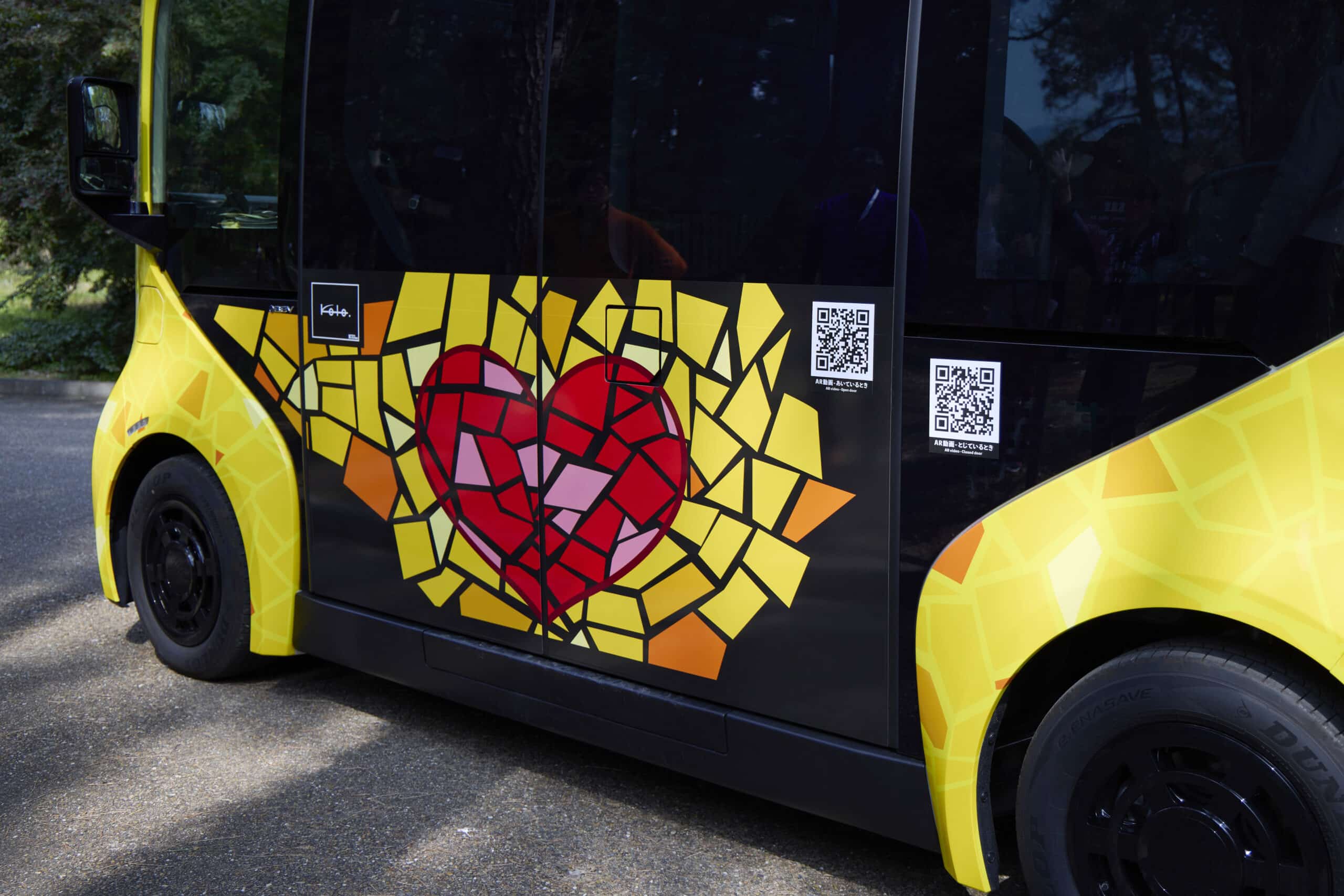 今回限定の特別なラッピングが施されたe-Palette。側面には石畳と、上賀茂神社のご神紋・二葉葵(ふたばあおい)をイメージしたハートマークのデザインがあしらわれました。