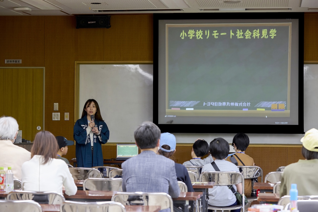 e-Paletteの試乗を終えたファミリーは、植物園会館の2階研修室に移動。福岡県にあるトヨタ自動車九州の宮田工場とリアルタイムでカメラをつなぎ、レクサスが作られる工程や検査の様子を見学しました。