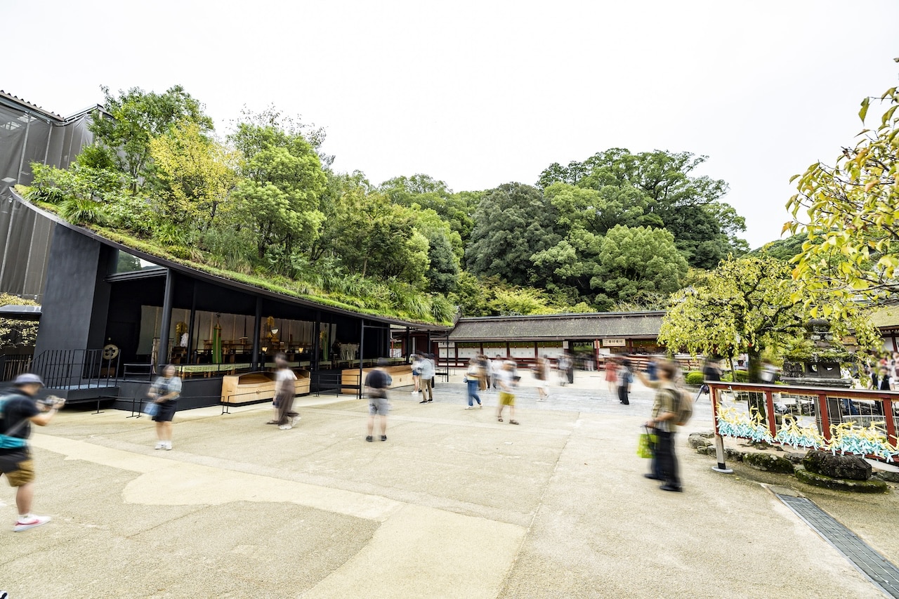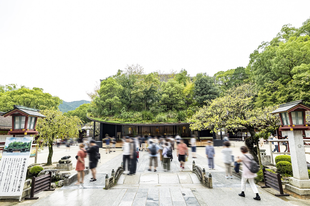2023年に建築家・藤本壮介によって誕生した仮殿もアート界の話題をさらいました。重要文化財でもある太宰府天満宮の御本殿は、2027年に予定されている「菅原道真公1125年太宰府天満宮式年大祭」のため、現在、3年がかりで改修中です。仮殿はその間の天神さまの仮の住まいであり、参拝の場所となっています。