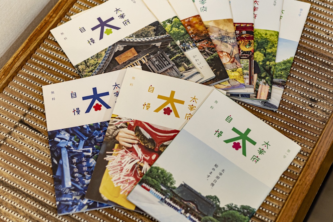 「太宰府天満宮」の文化研究所が、太宰府市観光駐車場協会と手を携えて制作、発行しているフリーペーパー「太宰府自慢」です。持ち歩きやすいハンディなA5サイズで、ボリュームはおよそ30ページ。「太宰府天満宮」および太宰府という地域の魅力を、ゆかりのある人々に“自慢”してもらうといった形式をとっています。梅の木を剪定する梅守など神社に関連するものもあれば、飲食店や近隣の低山、近くの神社など、これまで取り上げてきた話題はさまざま。観光名所としての案内というより、それぞれの奥深さが伝わってくるような内容で、かつ紹介役である“自慢する人”には地域への愛着があふれます。