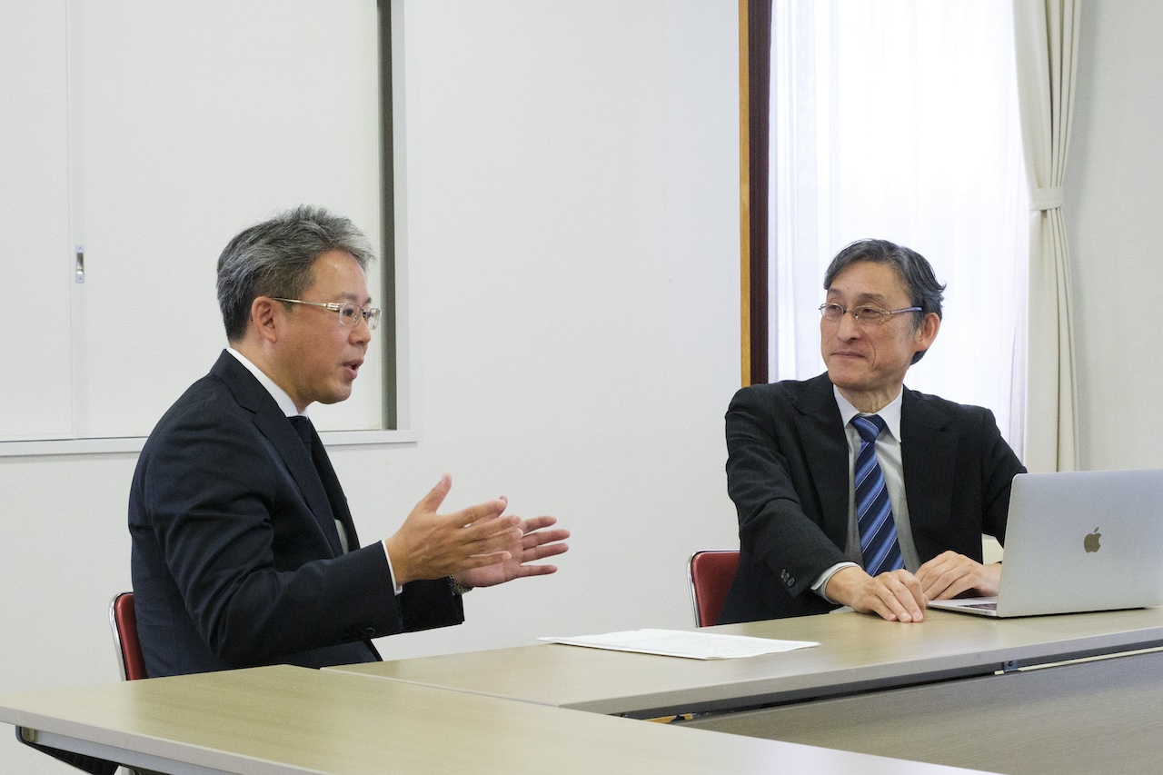 芸術の森の歴史について語り合う右谷部長(左)と吉崎館長(右)。