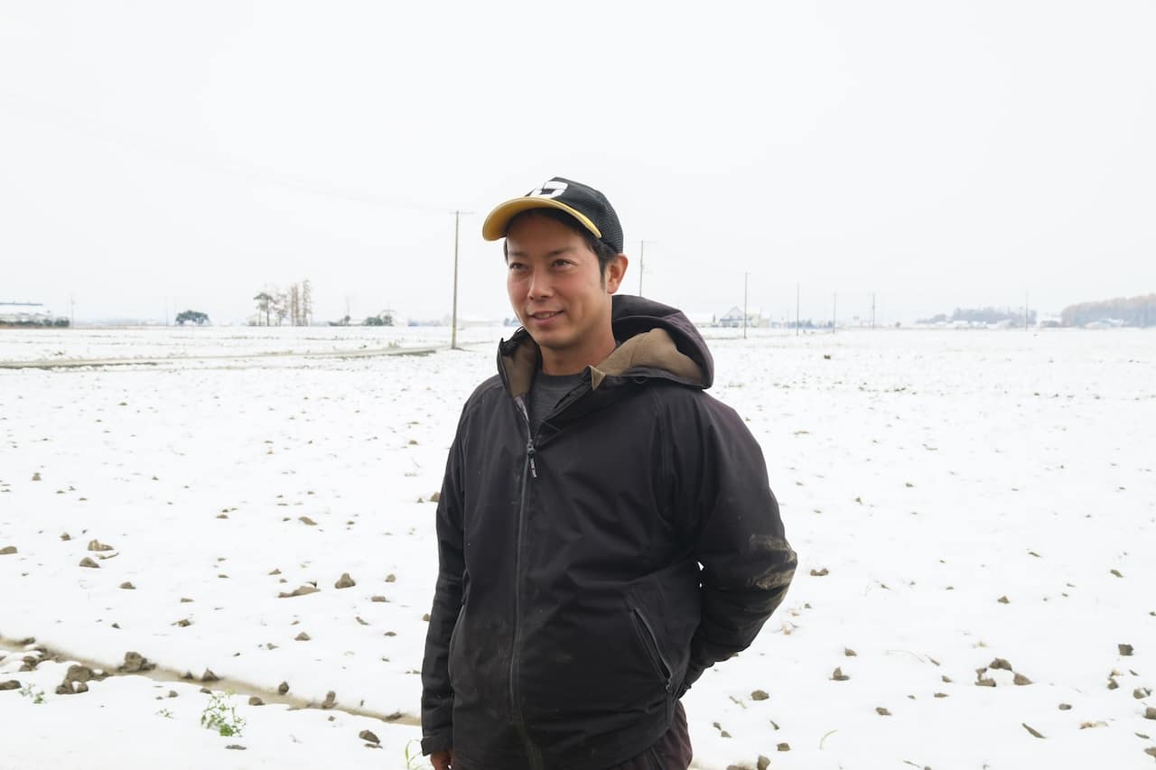 取材時、由栗いもの畑は淡い雪に覆われ、春の準備が静かに始まっていました。