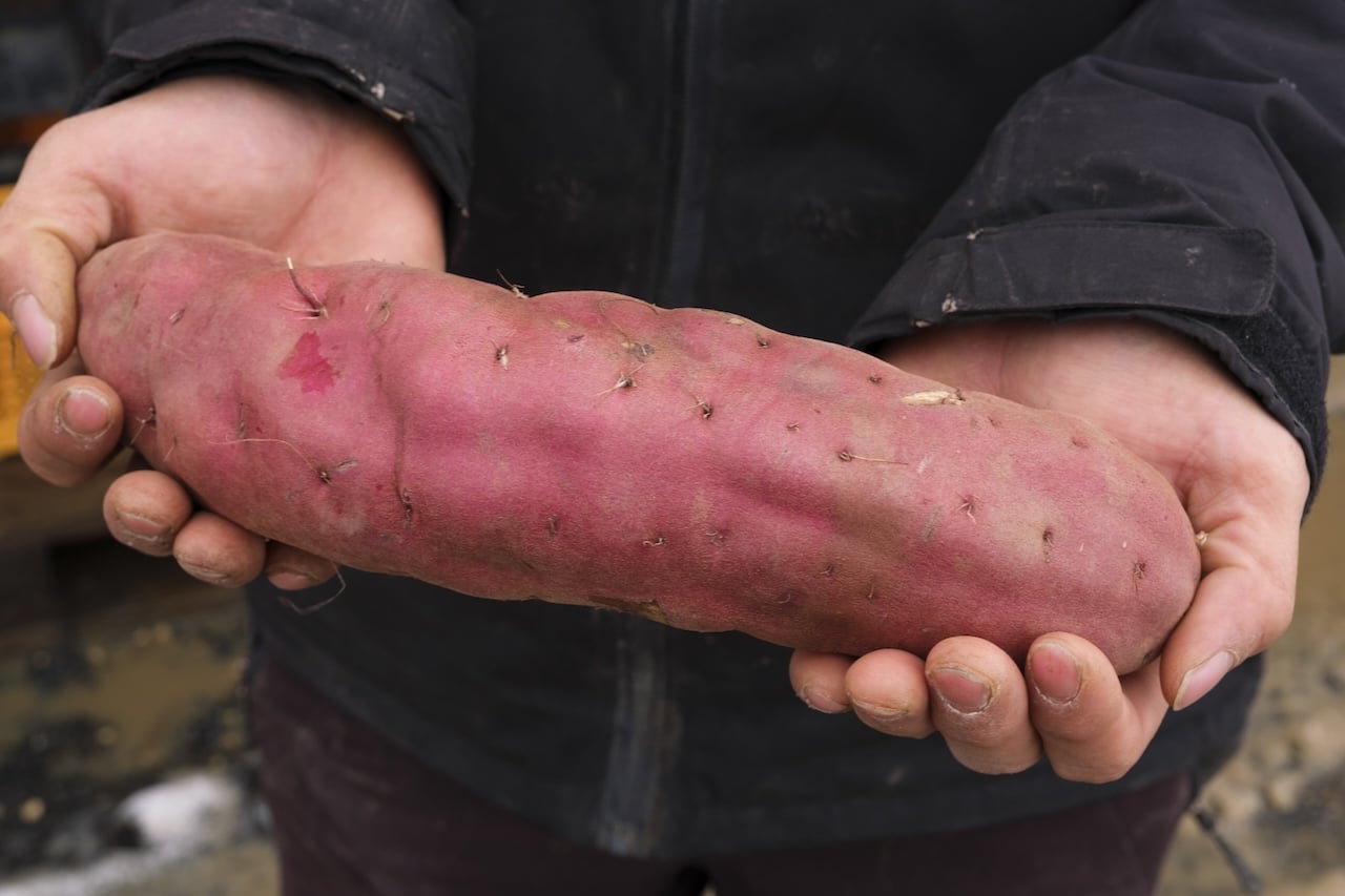 積算温度を稼ぐために本州よりも早め、5月上旬から由栗いもの栽培は始まる。その結果、収穫時はこのぐらいのサイズに。