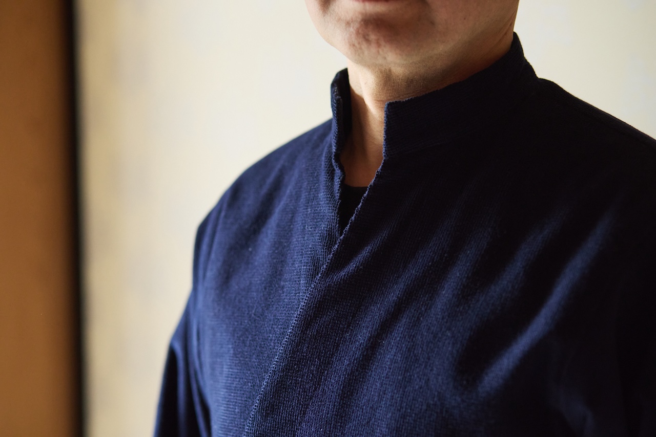 「通常の作務衣は襟元がVの字に開いているので、下に襦袢(じゅばん)のような白衣(はくえ)を着なければなりません。こちらは襟元が閉まっているので、白衣でなく動きやすいカジュアルなTシャツなどを着込むことができます。」