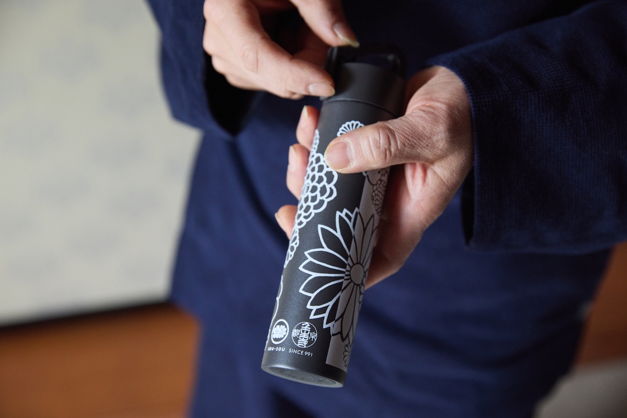こちらは「SOU・SOU」とのコラボレーションで誕生した水筒です。壬生寺の菊の紋、桜の紋、そして新選組の段だら模様を配置。「SOU・SOU」のロゴマークと壬生寺のマーク、そして創建年を表す「since 991」の文字も記されています。