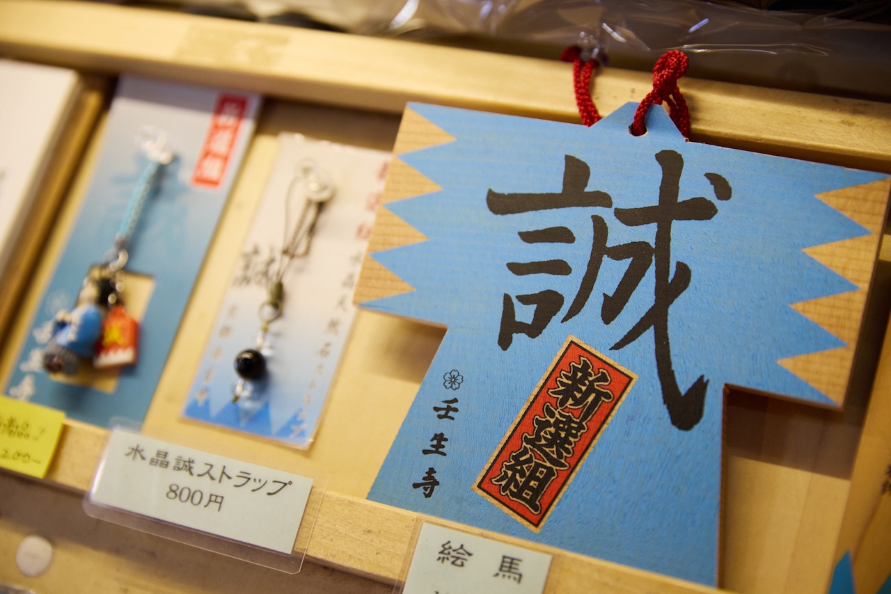 壬生寺の境内にある売店には、京都メイドの品が数多く並んでいます。聖護院八ツ橋は壬生寺のオリジナルパッケージ。前田珈琲のコーヒーは、松浦さんが自身でブレンドを手がけました。ほかにもストラップ、マスキングテープ、シールといった新選組グッズなどが販売されています。