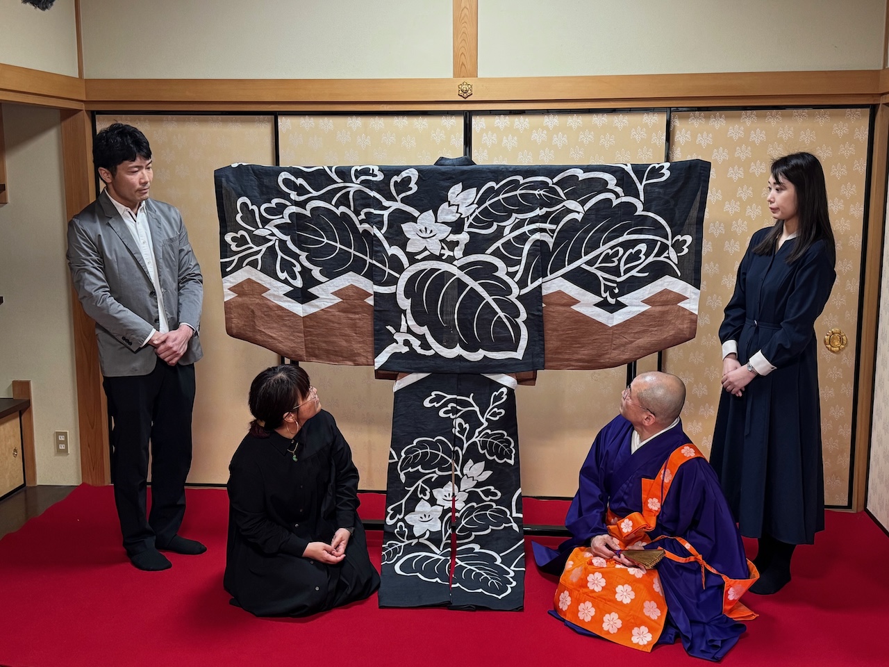 2024年、松浦さんは壬生狂言の衣装を復元新調するプロジェクトをスタートさせました。松浦さんが重視したのは、100年先を見据えた伝統技術の継承です。そのため、プロジェクトチームは30〜40代の職人メンバーで結成されました。織物は西陣織職人、染め物は型染め職人、デザインは日本画家・諫山宝樹(いさやま・たまじゅ)さんが手がけています。諫山さんは2024年のNHK大河ドラマ「光る君へ」の衣装デザイン、NHK連続テレビ小説「ばけばけ」の日本画指導を担当した日本画家です。
