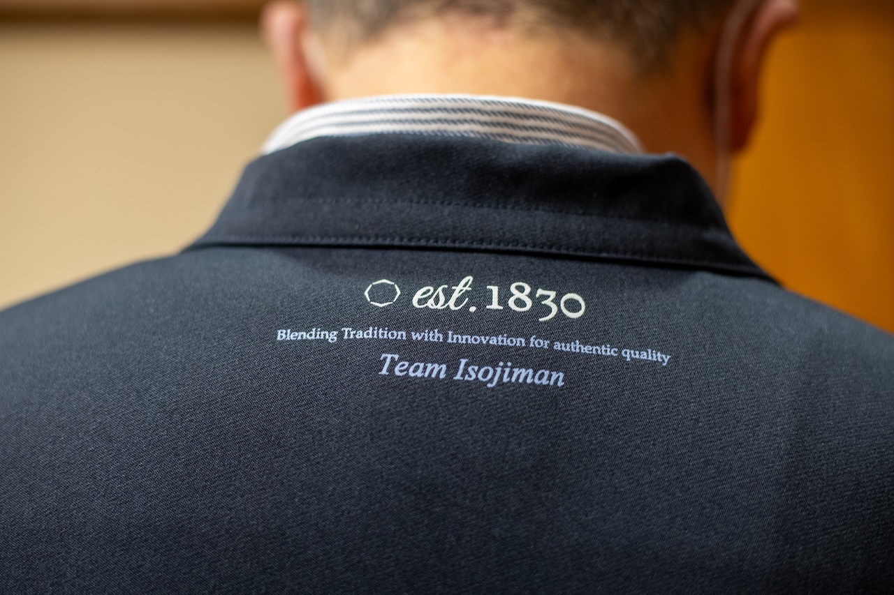 作業服にあしらわれる「Team Isojiman」。「Team」のワードに彼らの強い意志を感じる。また、磯自慢酒造のロゴは洗米された後の米の結晶がモチーフ。